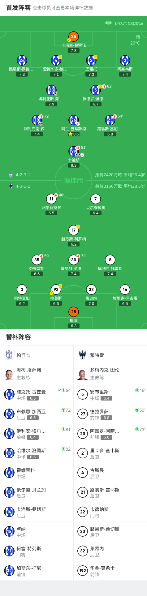 北京时间7月14日,墨西哥足球超级联赛春季联赛第1轮,帕丘卡坐镇主场迎战蒙特雷。比赛中,帕丘卡球员阿兰-包蒂斯塔送出助攻,帮助卡迪斯率先破门。随后不久,卡迪斯也贡献一次助攻,帮助阿列克谢-多明格斯扩大比分。比赛后期,维克托-古兹曼助攻埃利亚斯-蒙铁尔再下一城。最终,帕丘卡以3比0战胜蒙特雷。